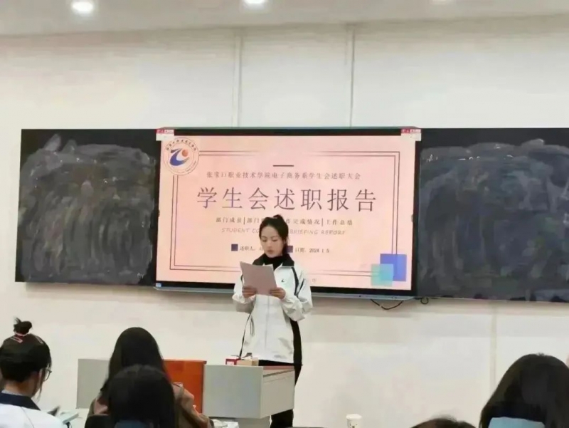 为深入贯彻落实团中央关于学生会组织深化改革的要求,进一步加强学生干部队伍监督与管理,全面准确地掌握学生干部的工作情况,提升团学组织的纪律作风和工作能力,打造建设精干高效的团学干部队伍,促进系部科学、规范、高质量发展,1 月 5 日电子商务系举行团总支学生会2023-2024学年秋学期团学干部述职擂台赛。