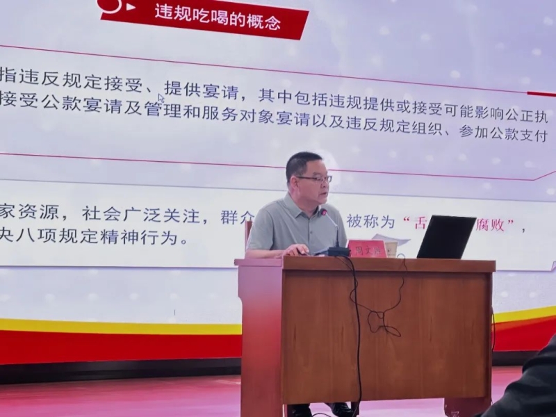 周文胜书记首先阐述了违规吃喝问题的严重性和危害性。他指出,违规吃喝不仅是个人行为失范的表现,更是对党的纪律和规矩的公然挑衅,严重损害了党的形象和公信力,破坏了党内政治生态的清明与纯净,带坏了社会风气。同时,近期中央纪委通报的多起违规吃喝典型案例,展现了违规吃喝问题的隐蔽性和复杂性,警示全体党员干部要时刻保持清醒头脑,严守纪律底线。