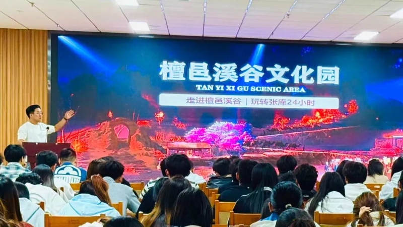 为精准对接文旅行业对新媒体复合型人才的迫切需求,电子商务系以深化产教融合为核心抓手,锚定电商理论与文旅推广实操衔接目标,联合檀邑溪谷景区举办短视频与直播实训,于9月16日下午,成功举办了专项培训会。檀邑溪谷营销企划部经理王宏光、主管李熠煊受邀为学生进行一线指导。