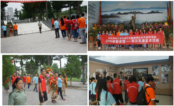 暑假前不久,两校团委进行了深入的交流与沟通,在确定实践的时间和目的地后,双方积极准备,招募志愿者,制定实践计划。三天的行程里,暑期实践服务团首先踏上了寻访英雄足迹的旅途,分别到董存瑞纪念馆和察哈尔烈士陵园等具有革命传统精神的场馆进行祭奠和参观活动,缅怀革命先烈,感受红色精神,增强社会使命感。