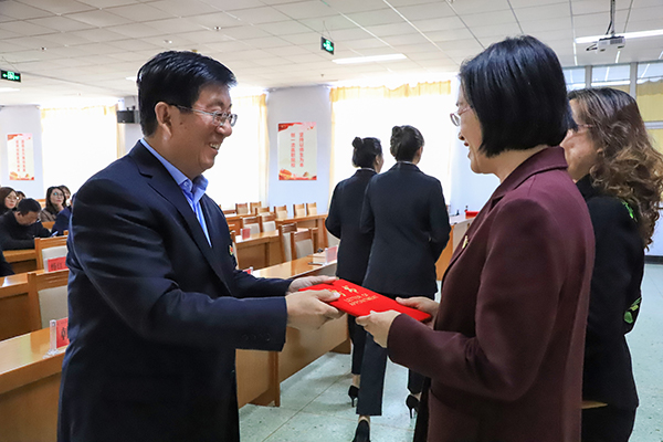 党委书记冯印涛为学院党建工作指导委员会委员颁发聘书;院长王立军为教育教学督导委员会委员颁发聘书。