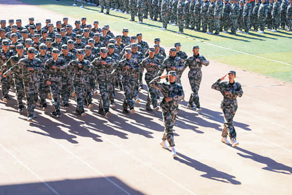 以班级为单位组成的分列式方队,迈着矫健的步伐,喊着嘹亮的口号,依次从主席台前走过,接受学院和军训部队领导的检阅。他们精神抖擞、目光如炬,年轻的脸庞上洋溢着青春的自信。