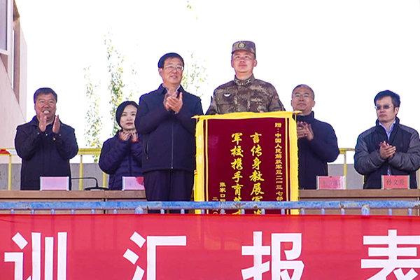 党委书记冯印涛向军训部队赠送锦旗。