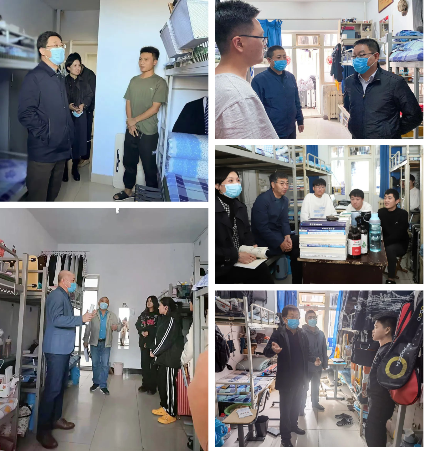 “寝室冷不冷?”“网课上得怎么样?”“有没有水果吃?”“口罩还有没有?”在各自包联的宿舍内,每位学院领导都要认真了解学生日常状况、实际问题和心理需求,细心聆听同学们对学院疫情防控工作提出的意见和建议。从饮食起居到校园安全,从课堂内容到学业规划,大家事无巨细一一询问,仔细收集学生诉求,为同学们的生活和学习保驾护航。一句句亲切叮嘱温暖着在场每一名学生的心。