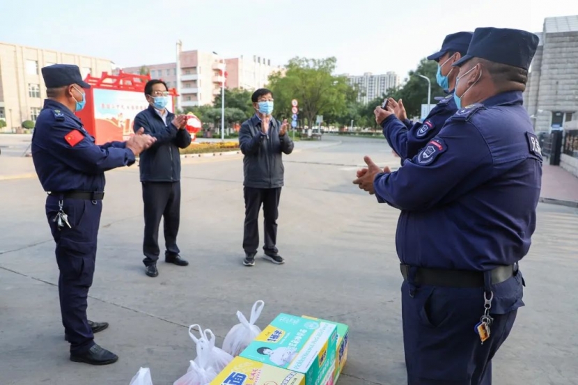 党委书记冯印涛专程来到学院门岗,亲切慰问了值守的每一位安保工作人员,送去慰问品。冯印涛代表学院党委向为全体师生健康安全把好最重要一关的安保人员表示感谢。他强调,作为学院疫情防控工作的最前沿和最终关卡,学院门岗值守工作责任重大,衷心感谢大家识大体、顾大局,不畏艰辛,坚守一线,为学院疫情防控取得阶段性胜利所作出的贡献。同时也希望大家着眼防疫大局,继续守住门、管好人、盯紧物、把好关,克服困难,敢打硬仗,全力以赴做好疫情防控工作,守好“责任田”,筑牢“防疫线”,为学校疫情防控工作再立新功。