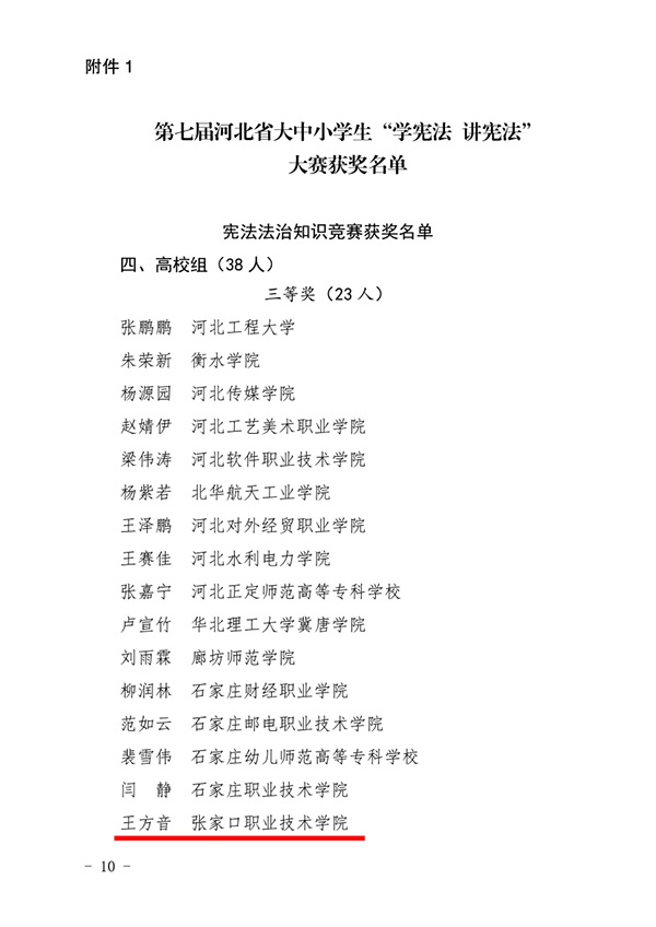 日前,河北省教育厅下发了《关于第七届全省学生“学宪法 讲宪法”活动情况的通报》(冀教政法[2023]4号),taptap点点被评为第七届河北省大中小学“学宪法 讲宪法”活动“宪法卫士”行动计划优秀组织单位。代表taptap点点参赛的汽车工程系学生岳腊梅和机电工程学院学生王方音凭借着过硬的素质和知识水平,分别获得“学宪法讲宪法主题演讲比赛”(高校组)二等奖、“宪法法治知识竞赛”(高校组)三等奖,学院教师李婧语、李昭荣获“高校组优秀指导教师”荣誉称号,为学院争得了荣誉。