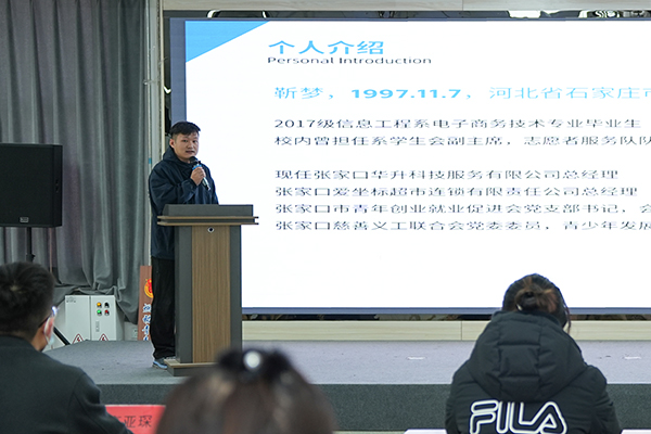 20届优秀毕业生代表、张家口华升科技服务有限公司总经理靳梦也受邀参加活动,并围绕个人创业历程、公益历程、职业思考等几方面内容与在场师生分享了创业经历和经验。