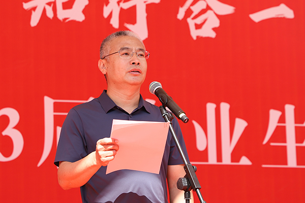 党委副书记、院长王立军以《做永远向上的青年》为题亲切寄语2023届毕业生。他代表学院全体师生员工,向2023届毕业生表示热烈祝贺和美好祝福,向悉心培育、细心呵护张职学子成长成才的老师们致以崇高的敬意。他强调,同学们在大学校园里见证了党的二十大胜利召开、中国共产党百年华诞、新中国成立70周年等伟大盛事,亲历了实现全面建成小康社会的伟大壮举。作为党的二十大后第一批毕业的大学生,2020级学子将投身全面推进中华民族伟大复兴的新征程,为实现中国式现代化的宏伟蓝图贡献青春力量。无论是走向工作岗位,还是选择继续深造,希望每一位毕业的同学,都能够坚持学习新知识,不断磨砺自己,不断丰富自己,筑牢适应时代之变的强大根基。作为新时代的大学生,一是要明德砺志、爱国奉献。要始终坚守崇高的理想信念,常怀感恩之心、厚植家国情怀,永担将“小我”融入“大我”的强国使命。秉持“修德砺能、知行合一”的校训,努力成为卓越工程师和大国工匠,在更大的舞台上书写美好乐章,为全面建设社会主义现代化国家贡献青春力量;二是要心存忧患、直面挑战。面对“百年未有之大变局”,“危”与“机”总是同生并存的,只有常怀忧患意识,居安思危,认清危中之需,抢抓发展之机,才能做到未雨绸缪,应对各种挑战,才能在今后各自岗位的方寸之地绘就大写人生;三是要勤学深思、锐意创新。面对快速而深刻的变革,要积极适应时代之变,跳出“舒适圈”,坚持终身学习,树立创新思维,才能更好地有所创造、有所作为,才能在发展中不断进步,超越自我。才能真正肩负起新时代赋予的使命,心怀“国之大者”,用青春和智慧书写精彩的人生答卷。