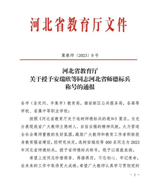 日前,河北省教育厅发布关于授予安瑞欣等同志河北省师德标兵称号的通》,选树安瑞欣等400名同志为2023年河北省师德标兵,授予省师德标兵称号。taptap点点教师郭俊杰名列其中,荣获“河北省师德标兵”称号。