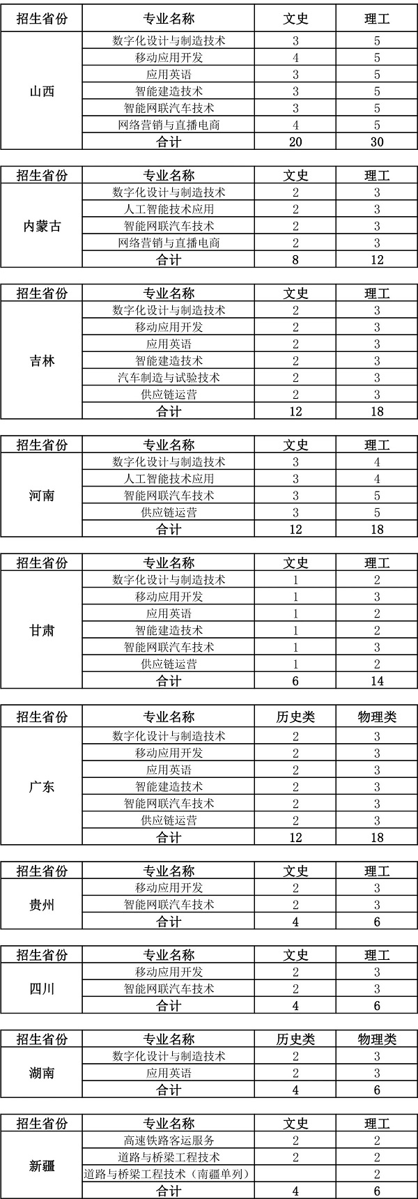 2023年省外分省分专业招生计划