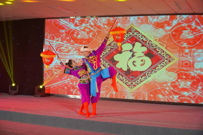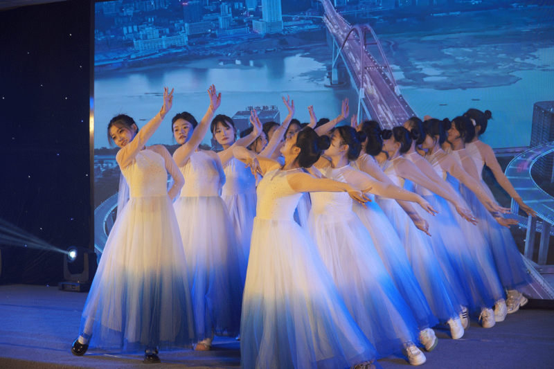 来自康保县康保县二人台艺术团的9位表演艺术家们则为师生们带来了康保干嗑《金笊篱》、二人台对唱《五哥放羊》、二人台歌舞《打金钱》和二人台舞蹈《挂红灯》。康保干嗑《金笊篱》展示了在精准脱贫、乡村振兴战略大背景下,“农家大妈网红队”利用网络空间展才艺,直销土特产品、推广乡村旅游,让乡亲们家家户户受益,成为“家乡农特产品的代言人”的故事;二人台对唱《五哥放羊》唱段反映了地主家女儿爱上年轻牧羊人的故事,唱出了五哥放牧生活的艰辛及三妹对他的爱慕之情;二人台歌舞《打金钱》表现了一对青年夫妻,因生活所迫街头卖艺的精彩演艺过程。作为二人台优秀传统剧目,其主要展示演员的唱念做打功力,也叫二人台硬码戏;二人台舞蹈《挂红灯》同样是二人台经典曲目,该曲目最初是一男一女以对唱形式出现,经后期演变形成现在的演员手持特色道具边歌边舞的表演形式。同时,taptap点点师生也表演了精心排演的舞蹈、诗朗诵、礼仪操及合唱、独唱等节目,精彩的演出博得了场内的阵阵掌声,将活动气氛掀向高潮。