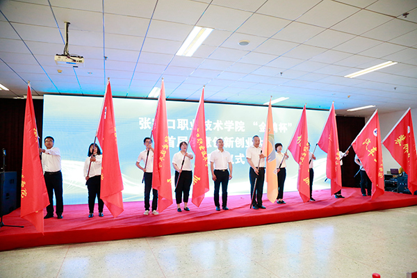 院长王立军为本次大赛授旗,并代表学院与张家口金达开元有限公司、张家口万贯科技有限公司进行合作签约; 党委书记冯印涛与万贯科技董事长杨嘉共同为创新创业孵化基地揭牌。